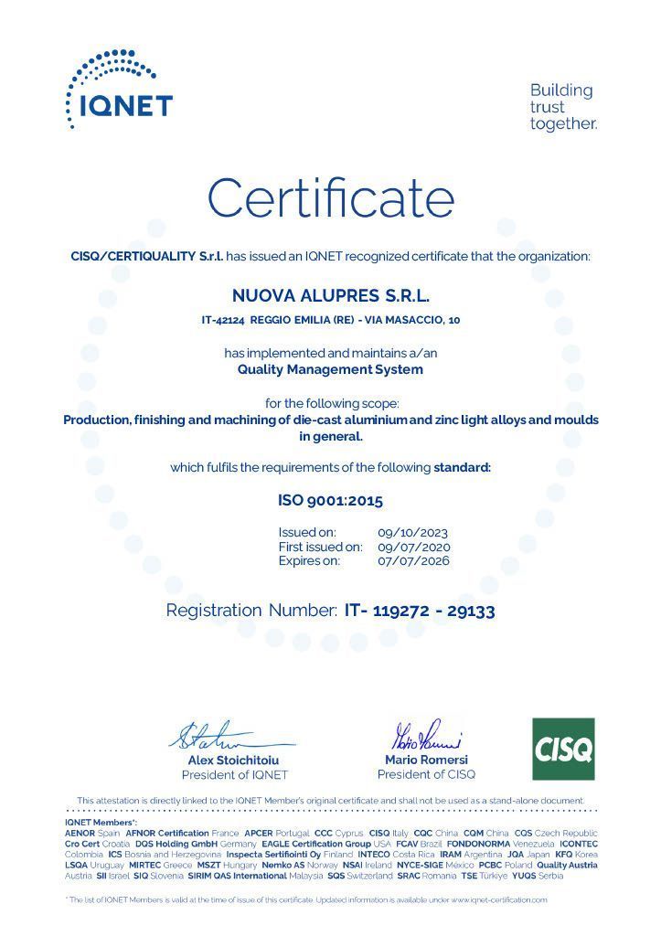 In seguito ai nostri severi controlli con strumenti statistici SPC, studi e analisi, Nuova Alupres è certificata ISO 9001-2015 ed è in procinto di ottenere la ISO 14001.